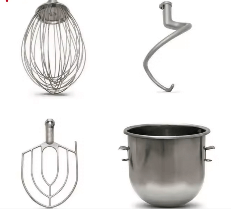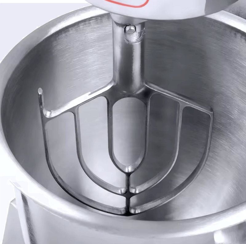 Our commercial Planetary Mixer comes equipped with three specialized attachments: the dough hook for heavy doughs like pizza bread, the flat whisk for cakes and batters, and the wire whisk for creams and egg whites. This comprehensive set enables perfect results across all mixing applications.
